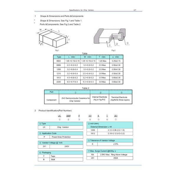 range of sizes from 0402 to 2220, and with a varistor voltage @1mA